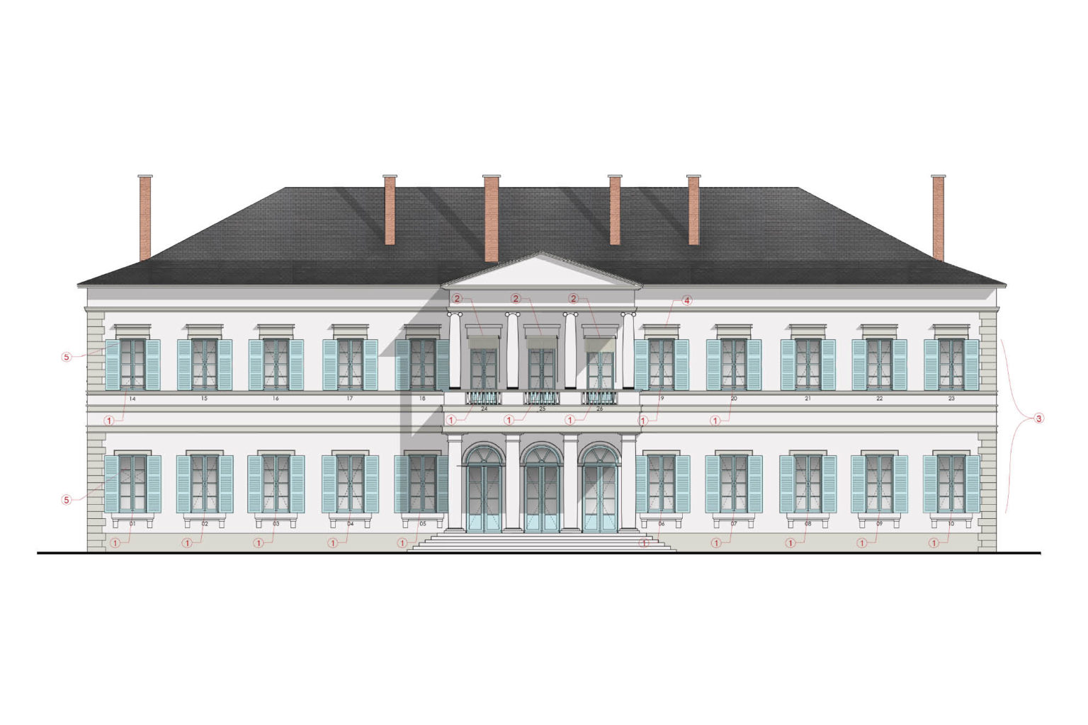 Dans le cadre d’une recherche d’amélioration de la gestion des déperditions d’énergie engagée par la Préfecture du Loir-et-Cher et constatant l’état sanitaire général relativement bon de la majorité des menuiseries de l’Hôtel à l’issu d’une étude Diagnostic, est retenu la restauration des menuiseries extérieures existantes, tout en préservant le caractère patrimonial des façades. Il a été choisi la restauration en atelier de l’ensemble des menuiseries avec remplacement des vitrages d’époque (de 4mm) par des vitrages collés étirés feuilletés (6.5mm). Les volets extérieurs ainsi que tous les éléments de ferronnerie sont restaurés également. Concernant la teinte des peintures, un relevé stratigraphique in situ a permis de faire apparaître une teinte gris perle, teinte d’origine derrière plusieurs couches de peinture. Ainsi, notre proposition est de restituer cette teinte d’origine, en remplacement de la teinte existante des menuiseries, lisses et volets et de décliner les tons selon le support.