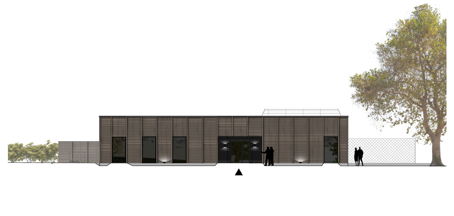 Le traitement architectural des façades correspond à l’expression de cette structure bois. Des montants verticaux rythment la façade, alternant parties opaques et fenêtres. Le revêtement choisi est un bardage en douglas auto- clave dont la partie visible est à claire-voie et dont le motif contraste avec la verticalité des montants. Son épaisseur garantit encore davantage la pérennité de la façade.