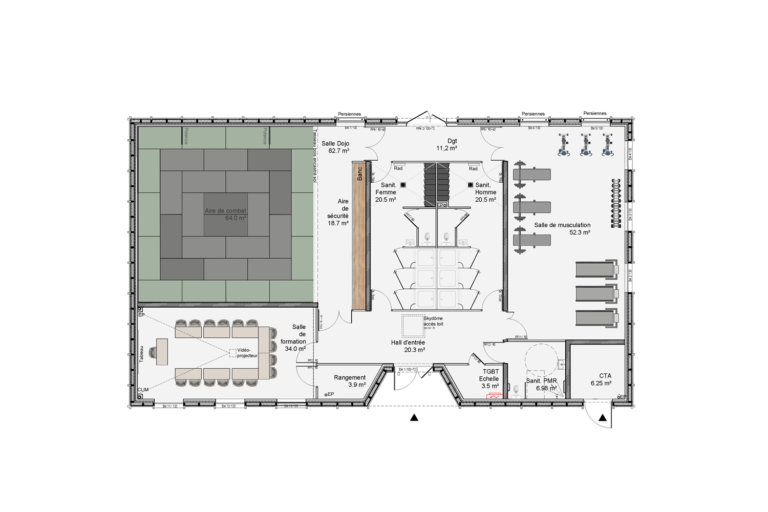 Le projet architectural du DOJO au CP de Châteauroux tend d’abord vers une sobriété constructive et énergétique, sans démonstration complexe. Cette organisation fonctionnelle et les portées du bâtiment amènent à envisager une structure bois.