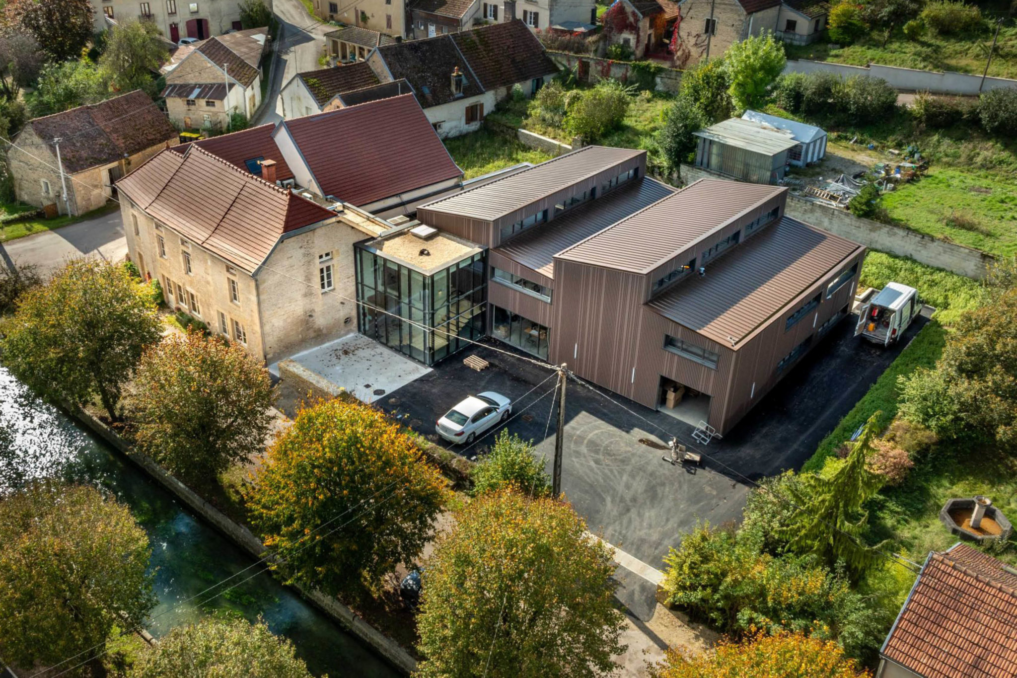 L’objectif premier est de restructurer les espaces existants afin d’apporter cohérence et fluidité notamment dans les déplacements du personnel et ainsi pouvoir intégrer au mieux les volumes à créer en extension. Ils s’implantent en parallèle de la Seine au nord du site et se composent de deux corps de bâtiment à l’architecture bien identifiée. Le nouvel atelier de production sur deux niveaux présente volumétrie marquée par une série de toiture en pente en écho aux habitations du village. Un second volume accueillera les zones techniques et bureaux, sa volumétrie plus basse en toiture plate fera le lien entre le vocabulaire bâti de l’existant et de l’extension.