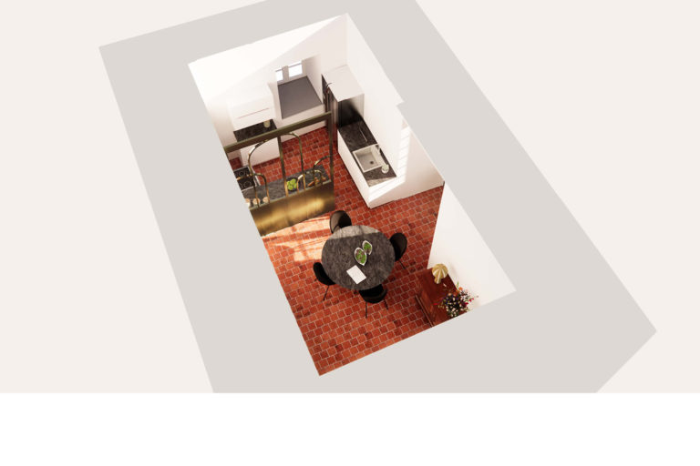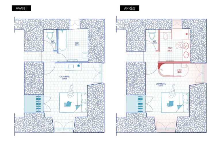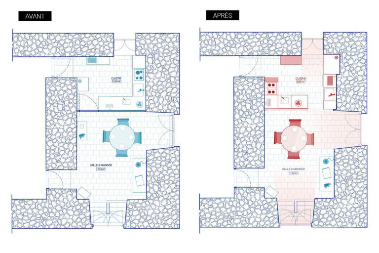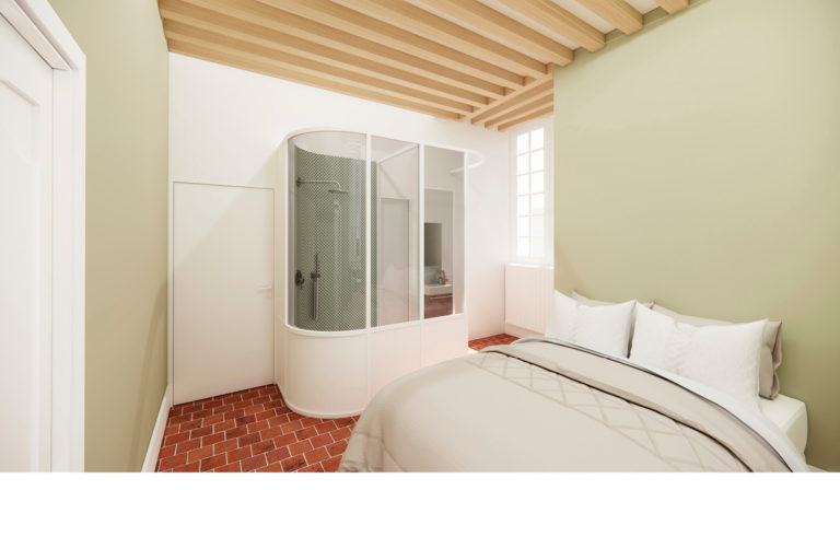 Le projet a également consisté à remanier deux espaces d’habitations au cœur de cette maison de famille : la cuisine/salle à manger ainsi qu’une chambre/salle de bain, chacun muré dans un espace défini de 7 m par 3,2 m entre d’épais murs de pierre du XIIe siècle. Les intérieurs sont restructurés de façon à obtenir des espaces plus fonctionnels pour des usages contemporains et de qualité par l’emploi de matériaux nobles et le traitement de la lumière naturelle. Nos propositions sont conçues pour être réversibles avec des interventions ponctuelles, justes et ciblées.