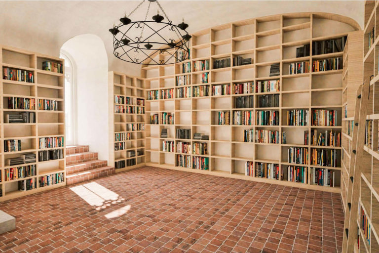 Ce projet était également l’occasion d’actionner une architecture du réemploi des matériaux sur site, avec l’usage de tommettes et de pierres locales existantes ou encore avec le travail du chêne issu des forêts du Morvan pour le meuble bibliothèque.