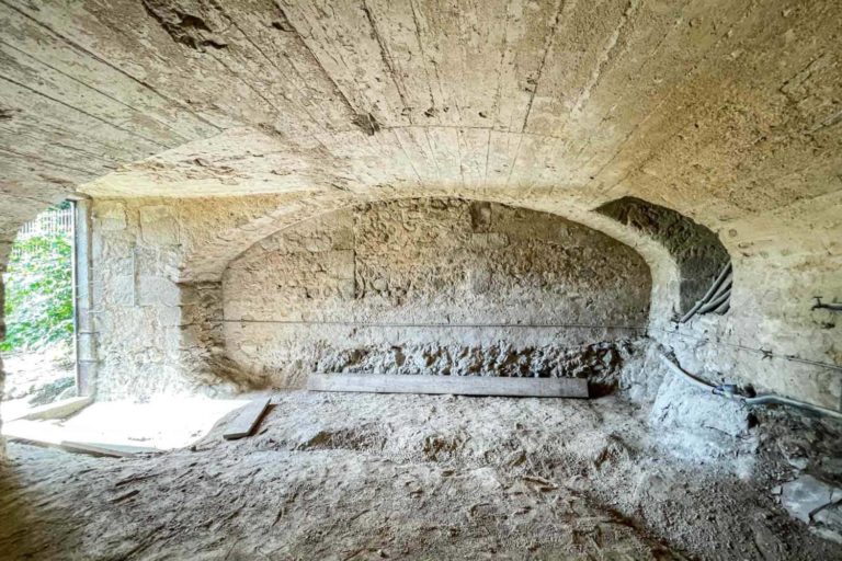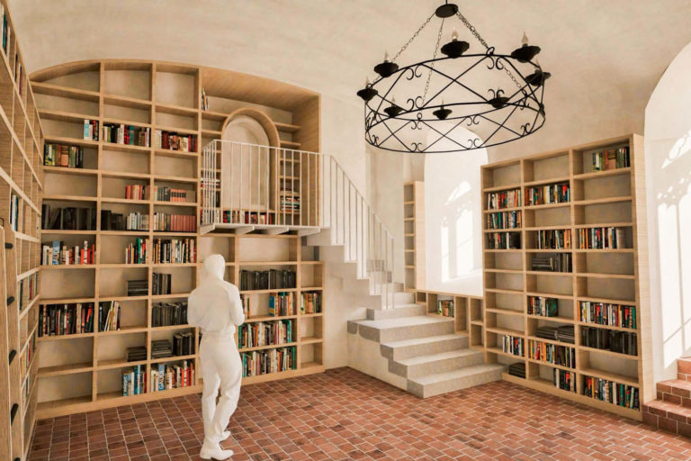 Le projet porte sur la réhabilitation et la restructuration des caves et ancienne chapelle semi-enterrées, de plain-pied sur le jardin, pour leur offrir de nouveaux usages. Pour ce projet, notre vision est de s’appuyer sur les qualités sensibles de ce patrimoine bâti, de les conserver et de les valoriser. Il s’agit donc d’intervenir sur l’existant ponctuellement tout en permettant la viabilité des nouveaux usages attendus : une bibliothèque et un espace dédié au vin. Dans cette recherche de mise en valeur du déjà là et de sobriété, la bibliothèque unitaire embrasse les parois de l’ancienne chapelle jusqu’à la naissance de la voûte. Elle dissimule les passages aux espaces contigus ainsi que les ouvrages techniques. Pour les anciennes caves, la voûte en anse de panier en pierre de taille, vocabulaire architectural marqueur de l’histoire du château, est révélée et libérée de tout cloisonnement. Un éclairage au sol souligne son profil singulier. Penser les usages futurs de ce patrimoine médiéval dans une perspective plus longue que la demande présente des commanditaires a également animé notre restructuration de ces espaces.