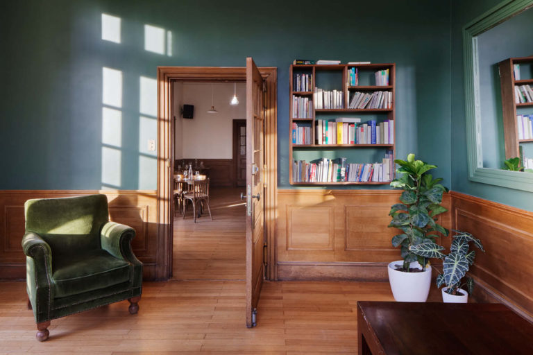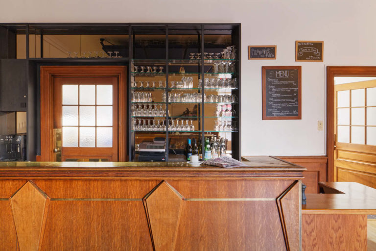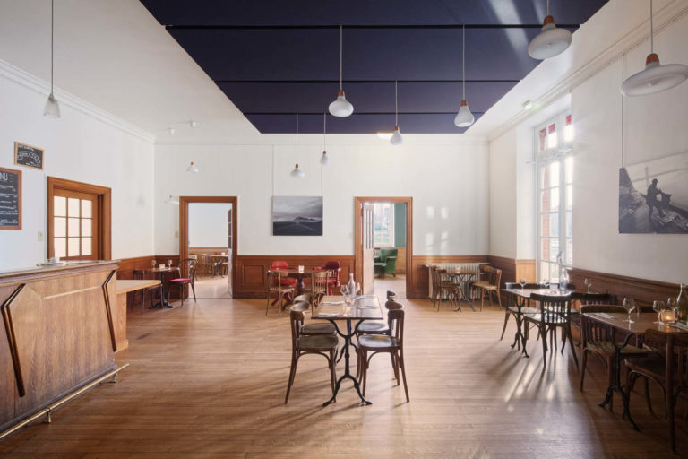 Afin de respecter les réglementations de sécurité et d’hygiène, cette restructuration et cette transformation de l’existant se sont concrétisées par un agrandissement du volume de la cuisine, par le désamiantage des sols existants, par la mise en place d’un traitement mécanique de l’arrivée d’air de la cuisine, par la création d’une nouvelle évacuation des eaux usées au sol, par la création de nouvelles issues de secours en lien avec le changement de la classification E.R.P. Toutes ces interventions, faites par acupuncture, mettent en valeur le patrimoine existant, donnant l’impression d’avoir toujours été là.