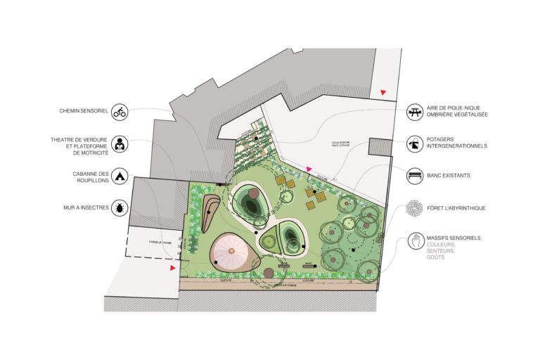 Le projet d’aménagement du jardin de la crèche Petit Cîteaux à Dijon transforme un vide urbain en un espace vivant, sécurisé et propice à l’éveil des tout-petits. En prolongement de la courette existante, le jardin se déploie en plusieurs îlots, chacun dédié à une activité : tipi pour la sieste, petit théâtre, labyrinthe végétal, parcours cyclable, chemins sensoriels et potagers intergénérationnels.