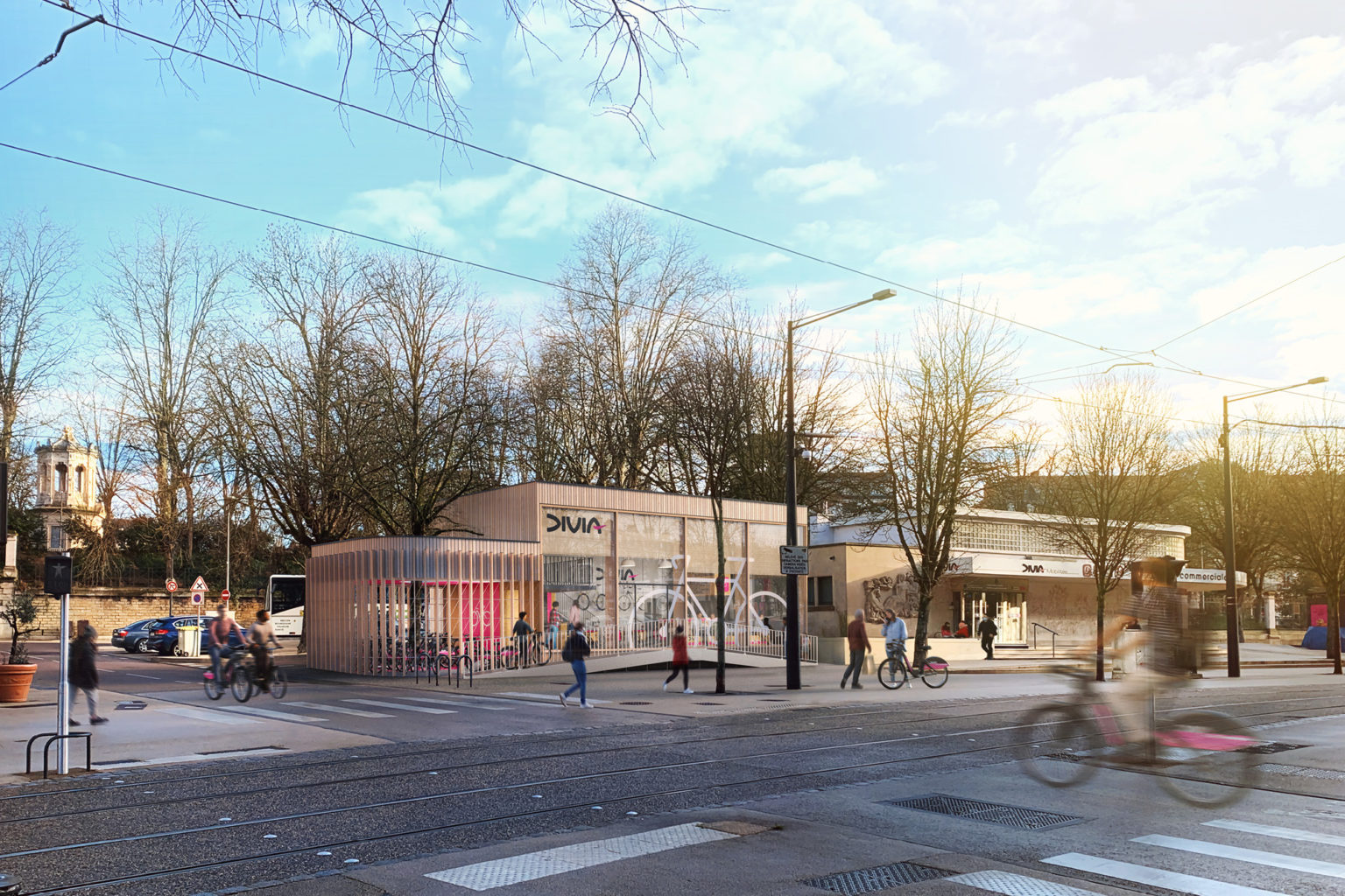 La place Darcy entre la gare et le centre-ville de Dijon, s’est trouvée être le lieu géographique capable d’accueillir ce projet, dans un bâtiment en prolongement de l’actuel bâtiment d’accueil Divia. L’emprise du bâti a fait l’objet d’une étude urbaine. Il s’agissait de ne pas dénaturer la place, de limiter la suppression de places de parking, de garder la plupart des arbres qui font son identité et son confort urbain, de composer harmonieusement avec l’architecture remarquable du bâtiment Divia existant. D’un point de vue programme, l’enjeu était de réunir en un seul lieu un point de location de vélos, un espace de stationnements sécurisés, un service de maintenance pour les particuliers et les entreprises, l’accompagnement vers l’achat d’un vélo personnel entre autres. Il a été retenu l’usage d’une structure et d’un ossature en bois détachées du sol existant de façon à assurer la réversibilité du site à d’autres usages en impactant le moins possible cette place urbaine. Le bois fait également son apparition sous la forme de bardages en façade, offrant une grande flexibilité dans le positionnement des ouvertures et des formes courbes. L’alliance du bois à la minéralité du contexte, du bâtiment pierre existant, permet le dialogue des interventions. Afin de respecter le budget alloué à cette opération, il a été choisi de réaliser un intérieur épuré, de limiter les ouvrages de finitions. Ainsi, les vélos Divia, suspendus au mur deviennent des éléments scénographiques visibles depuis la rue à travers les grandes baies vitrées, orientées sur la ville. Un atelier de préparation est tourné vers les utilisateurs faisant partie intégrante de l’animation de la vélostation. Une attention particulière est accordée à la signalétique, dans la colorimétrie de la charte Divia Mobilités, pour donner l’identité et l’attractivité du lieu. Des pictogrammes sont rapportés sur les sols intérieurs ainsi que sur la façade vitrée, participant à l’animation du site, de jour comme de nuit.